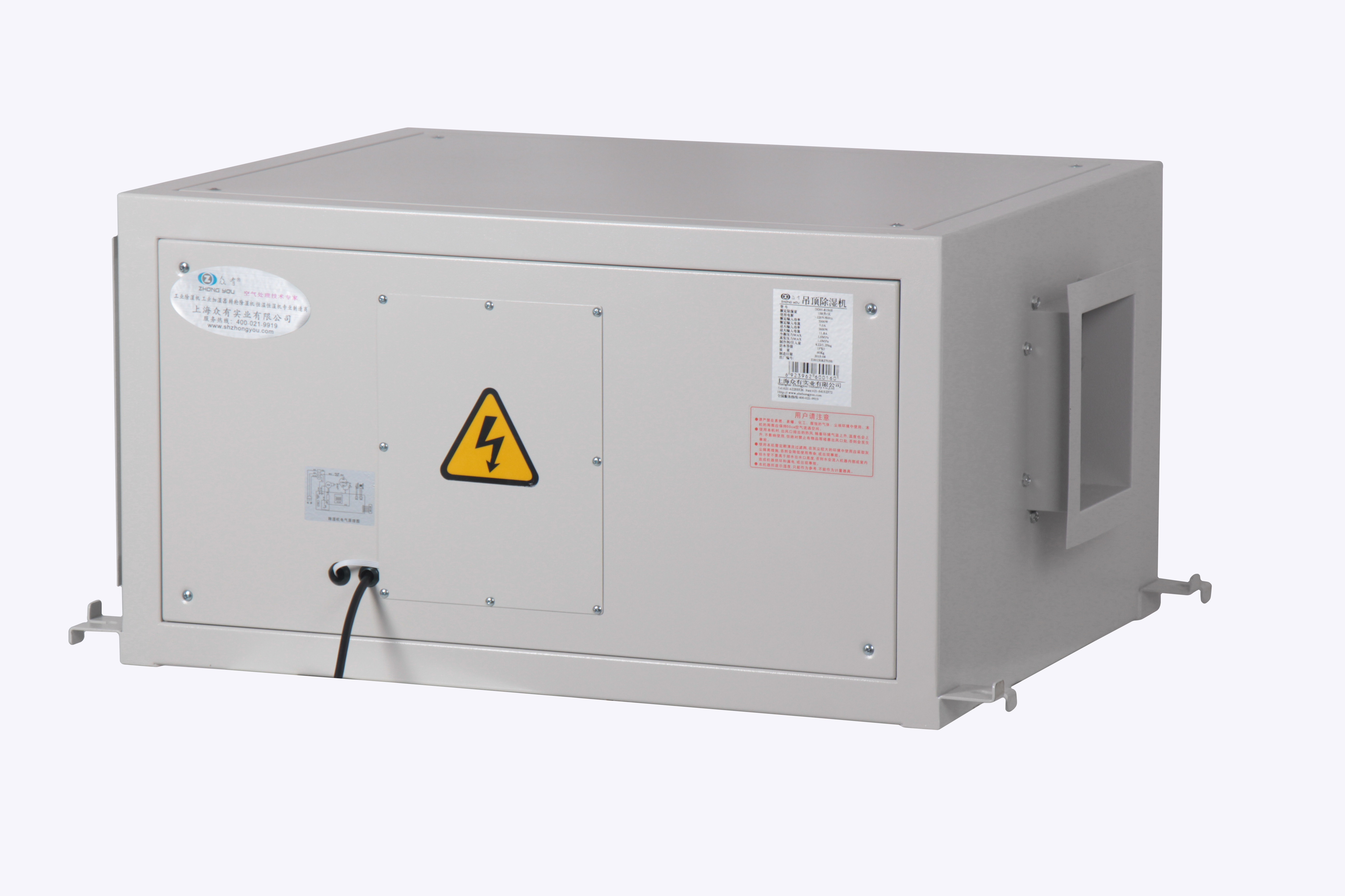 有效維持干爽恒濕度的工作環境:吊頂除濕機能準確量度和維持室內濕度在一個理想的穩定范圍。可以為對濕度有高要求的原材料、成品、檔案和精密電子設備等有一個良好的儲存環境。
